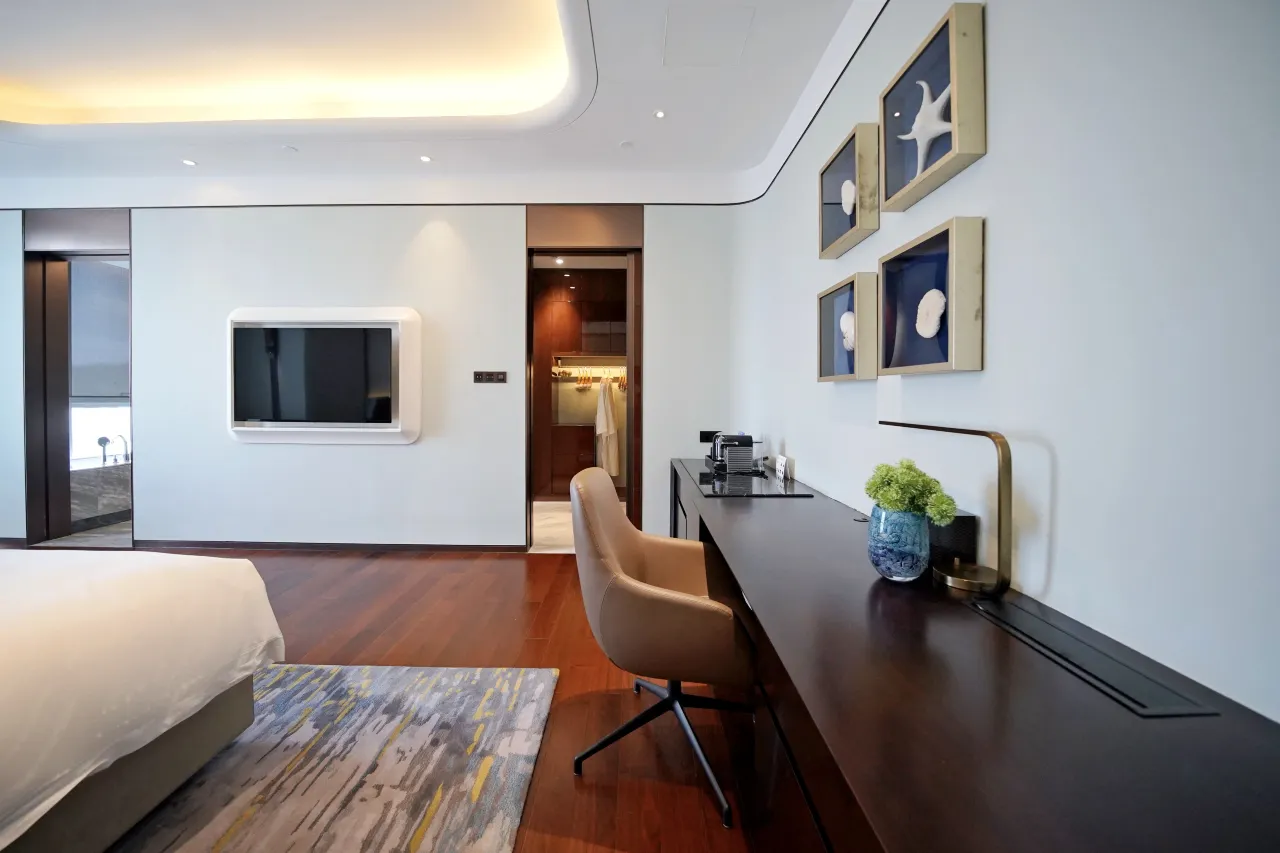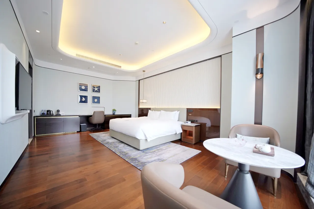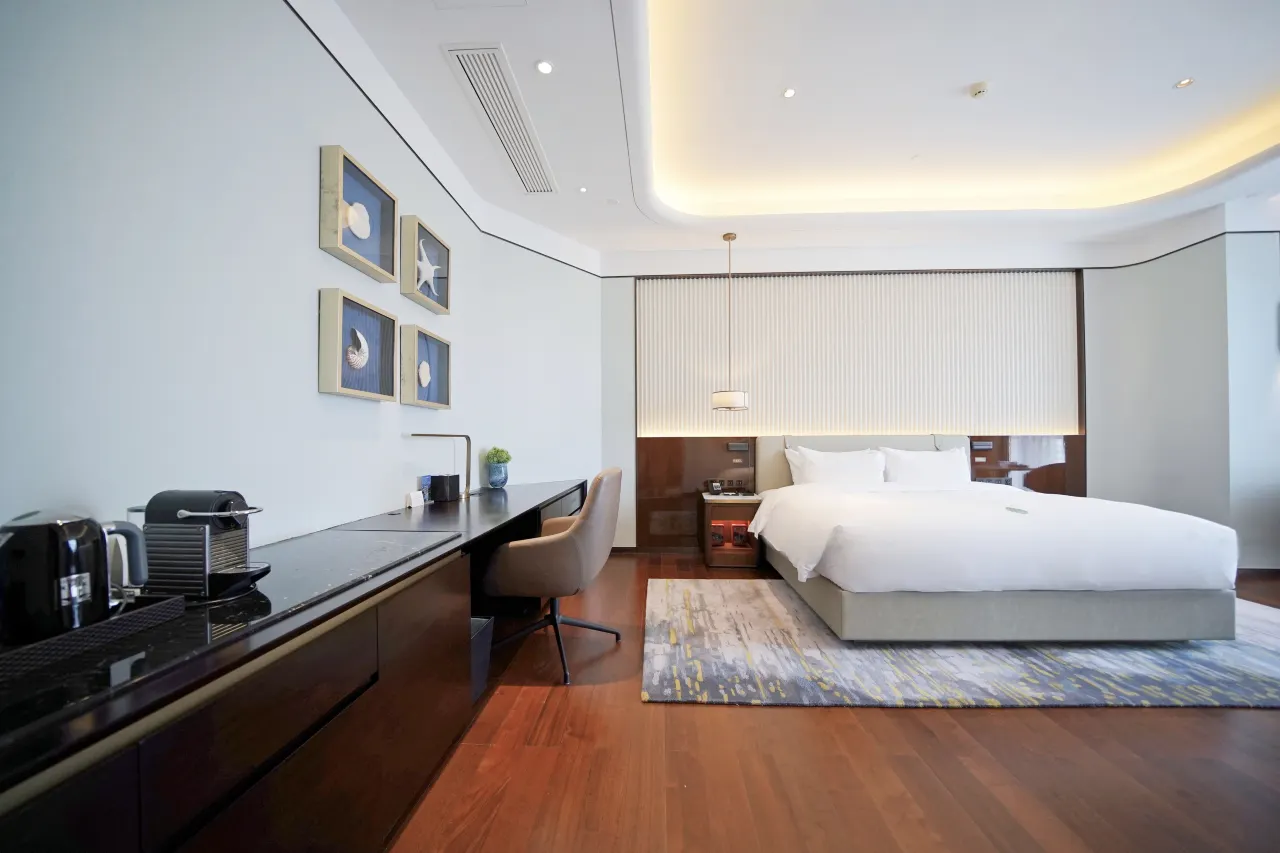 Dieses weitläufige Büro befindet sich im 5. und 17. Stock. 45 m² großes Heiligtum Das Zimmer besticht durch eine elegante, moderne Ästhetik. Es verfügt über einen riesigen 2 m breites Kingsize-Bett (Extra-lang) mit hochwertigen Bettdecken und zusätzlicher Bettwäsche für einen erholsamen Schlaf. Große Fenster bieten einen doppelten visuellen Genuss: das lebendige, schimmernde Licht Skyline von Zhuhai auf der einen Seite und die ruhige, üppige Berggrün auf der anderen Seite.