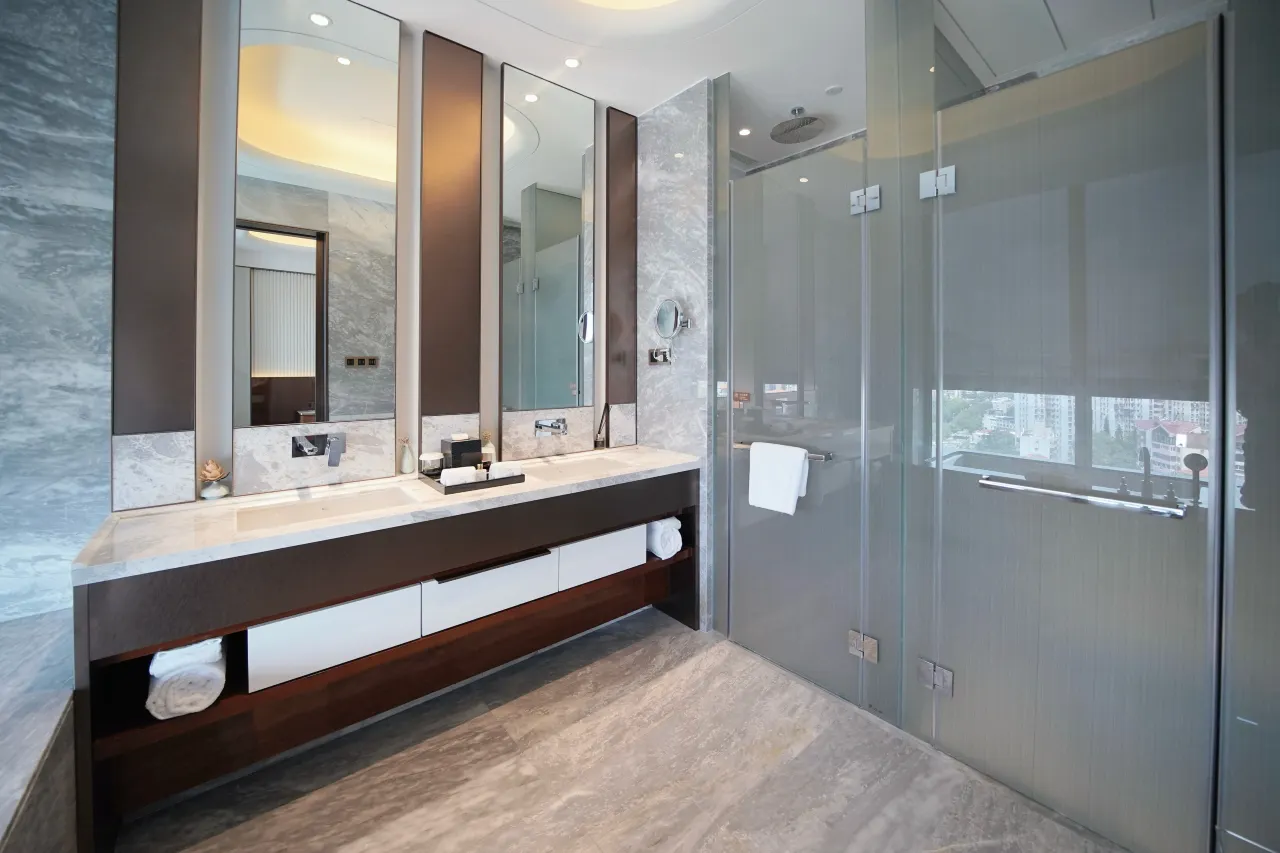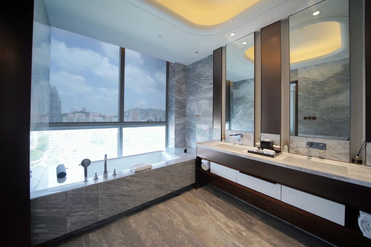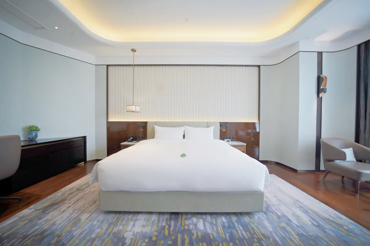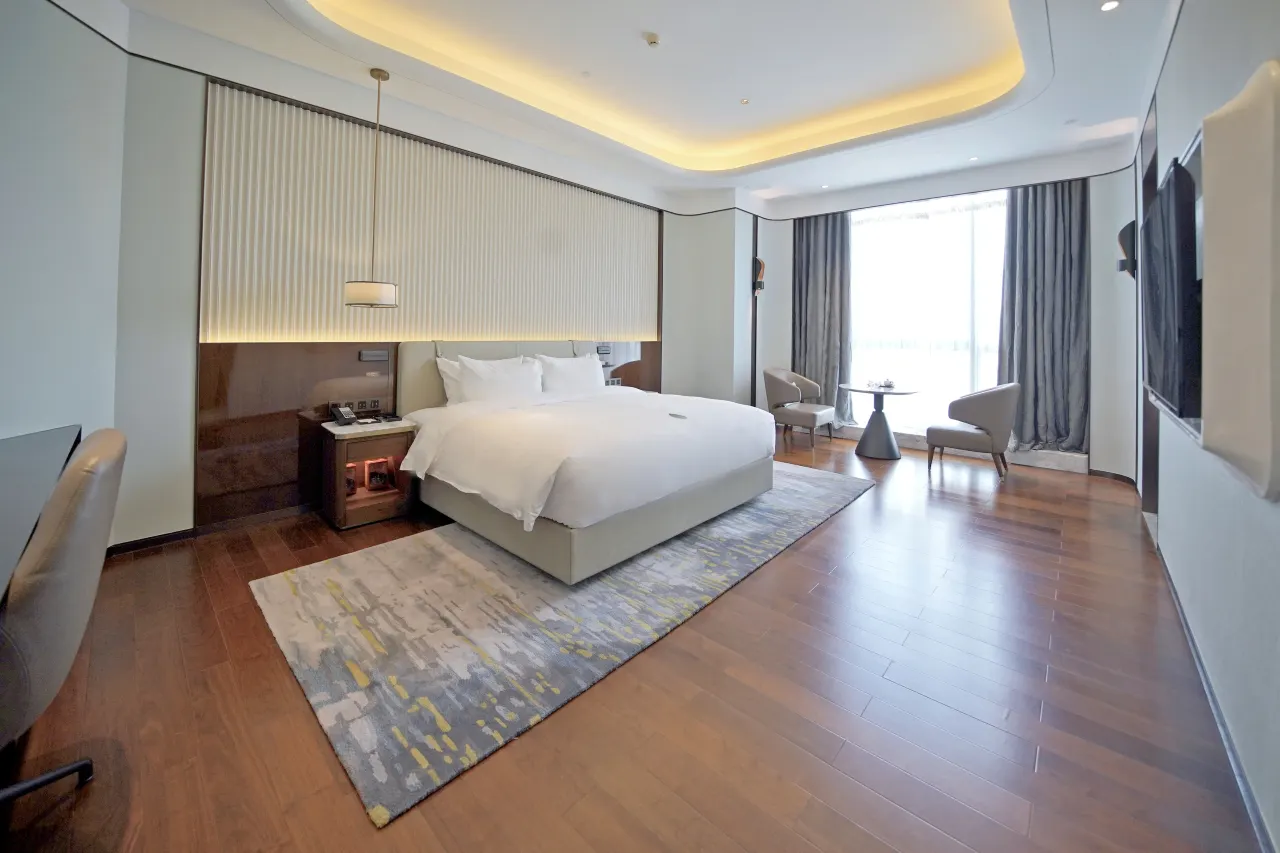 Dieses weitläufige Büro befindet sich im 5. und 17. Stock. 45 m² großes Heiligtum Das Zimmer besticht durch eine elegante, moderne Ästhetik. Es verfügt über einen riesigen 2 m breites Kingsize-Bett (Extra-lang) mit hochwertigen Bettdecken und zusätzlicher Bettwäsche für einen erholsamen Schlaf. Große Fenster bieten einen doppelten visuellen Genuss: das lebendige, schimmernde Licht Skyline von Zhuhai auf der einen Seite und die ruhige, üppige Berggrün auf der anderen Seite.
